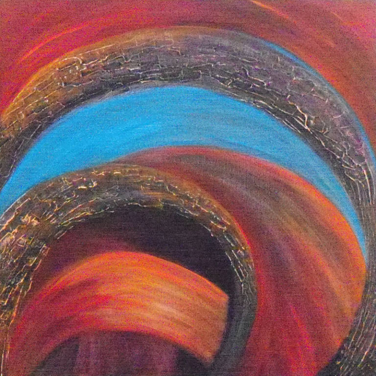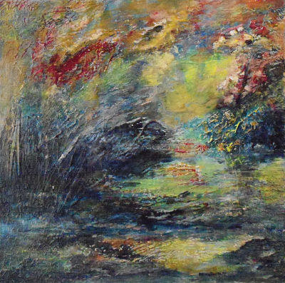 I had some great fun creating this piece! I referrred to a reference photo with I had previously painted representationally and decided to abstract it. I know what the original photo was, but you can decide what you see in the splashes of colours and textures that vibrate on this canvas.