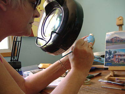 Working through a magnifying light, I use tiny brushes to ensure that each hand-painted image has as much detail as possible. Sometimes, the tiniest stroke has the biggest impact. When Mark received the ornament of his castle/home, he exclaimed, “She even painted the garage door opener!” While I was unaware of the identity of the dark spot on the photo, I decided it was important enough to include. I guess it was.